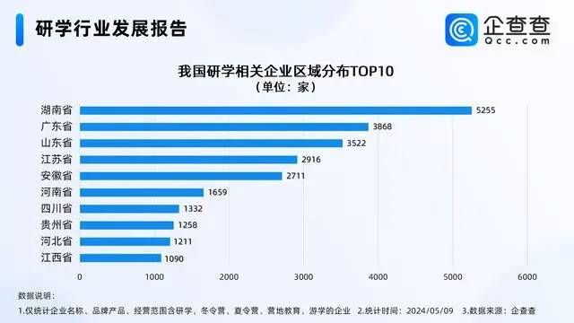 企查查数据显示,国内现存研学相关企业3.56万家。从注册趋势来看,2018年研学热度初现,注册量猛增100.95%达6360家。2019年依然保持高热度增长,首次破万,注册量达1.27万家,同比增长99.59%。而后受环境等相关因素影响,其注册量有所回落。2023年注册量回温,达2961家,同比增长76.25%。截至目前,今年已注册1000家研学相关企业,其中前4月注册量达971家,距去年同期增加85家。从区域来看,湖南以5255家,居全国第一。广东、山东分别现存3868家、3522家,位居前三。此后是江苏、安徽等地。