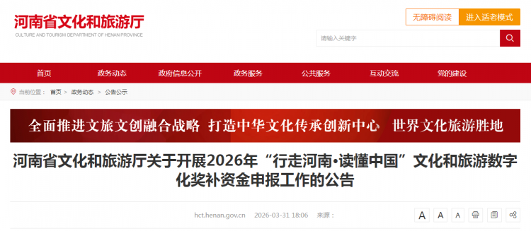 河南省文化和旅游厅近日发布《关于开展2026年“行走河南·读懂中国”文化和旅游数字化奖补资金申报工作的公告》(以下简称《公告》),将联合省财政厅对部分优质文化和旅游数字化项目进行奖补。