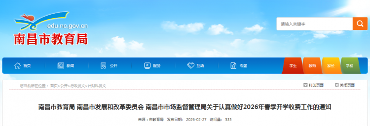 近日,南昌市教育局、南昌市发展和改革委员会、南昌市市场监督管理局发布《关于认真做好2026年春季开学收费工作的通知》(以下简称《通知》),公布了中小学服务性收费和代收费项目及标准。